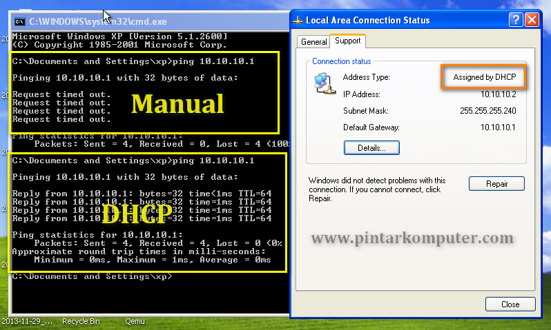 Kedua, kita setting IP address secara DHCP (otomatis) pada PC klien. Dan lakukan tes ping ke IP ether2 MikroTik (10.10.10.1). Pada hasil ping, terlihat bahwa koneksi antara router dan PC berhasil.